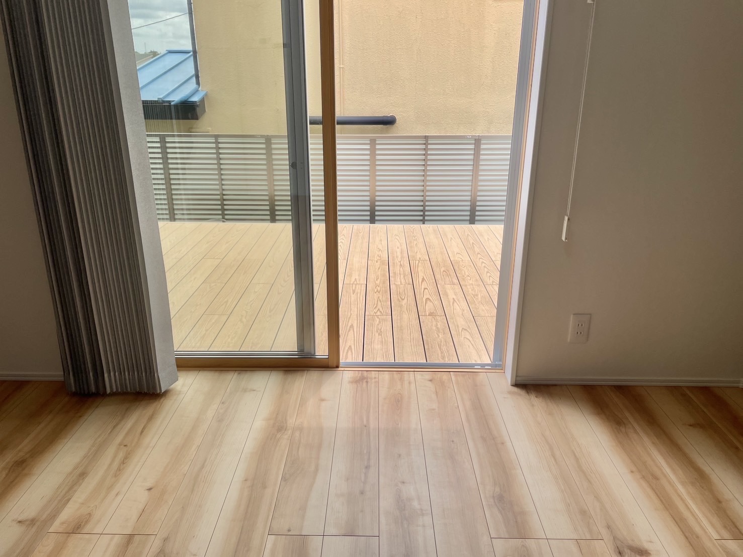 ウッドデッキの床の高さを限界まで上げることで、リビングからの段差を極力なくすように施工しました。